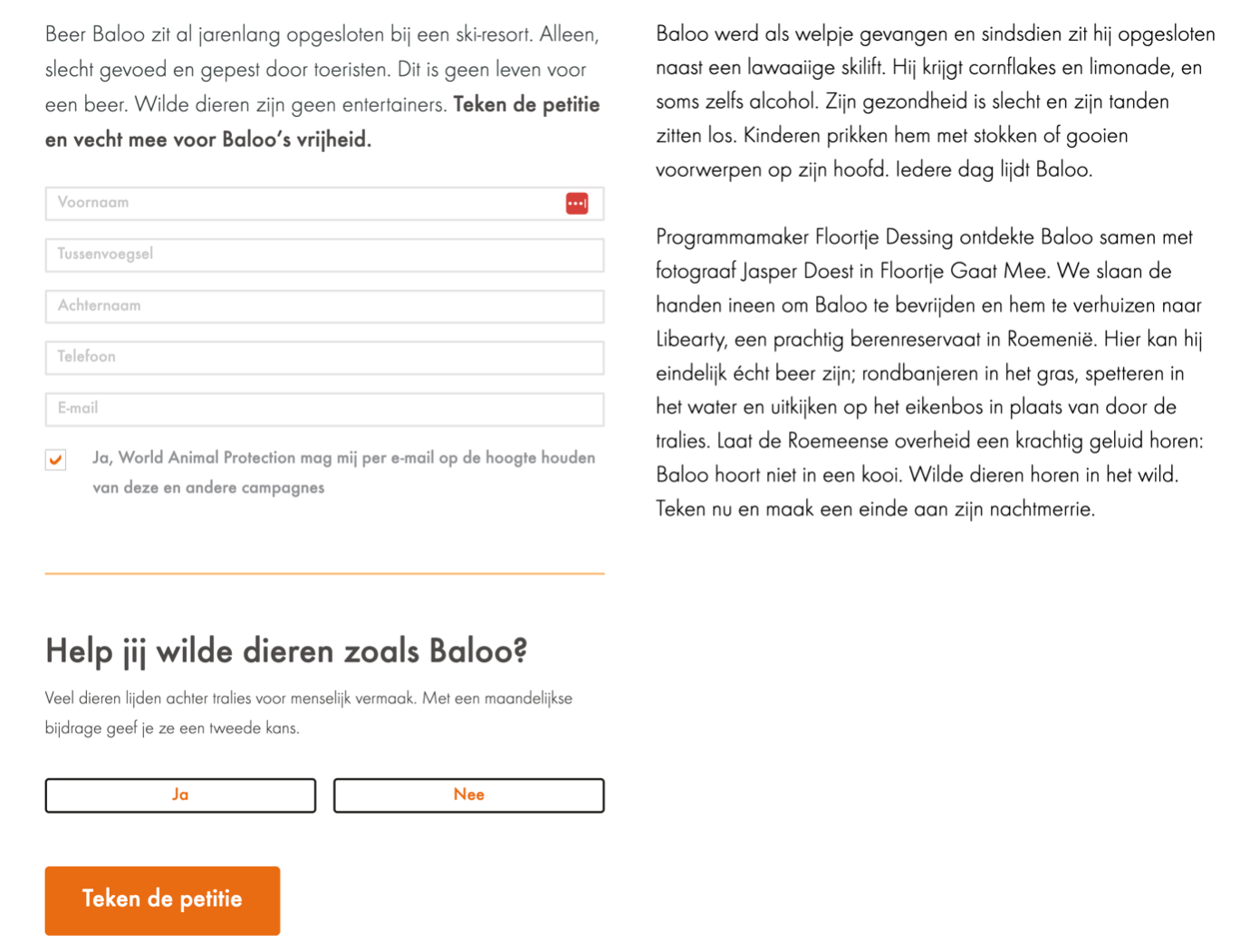 2. Leadwerving en fondsenwerving combineren in 1 formulier, voorbeeld World Animal Protection. In het formulier heb je direct de optie om, naast de petitie te tekenen, ook direct donateur te worden.