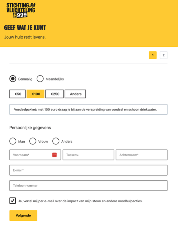 1. Donatiebedragen per segment en/of per persoon aanpassen, voorbeeld Stichting Vluchteling. Op basis van segment worden andere giftbedragen getoond in hetzelfde formulier.