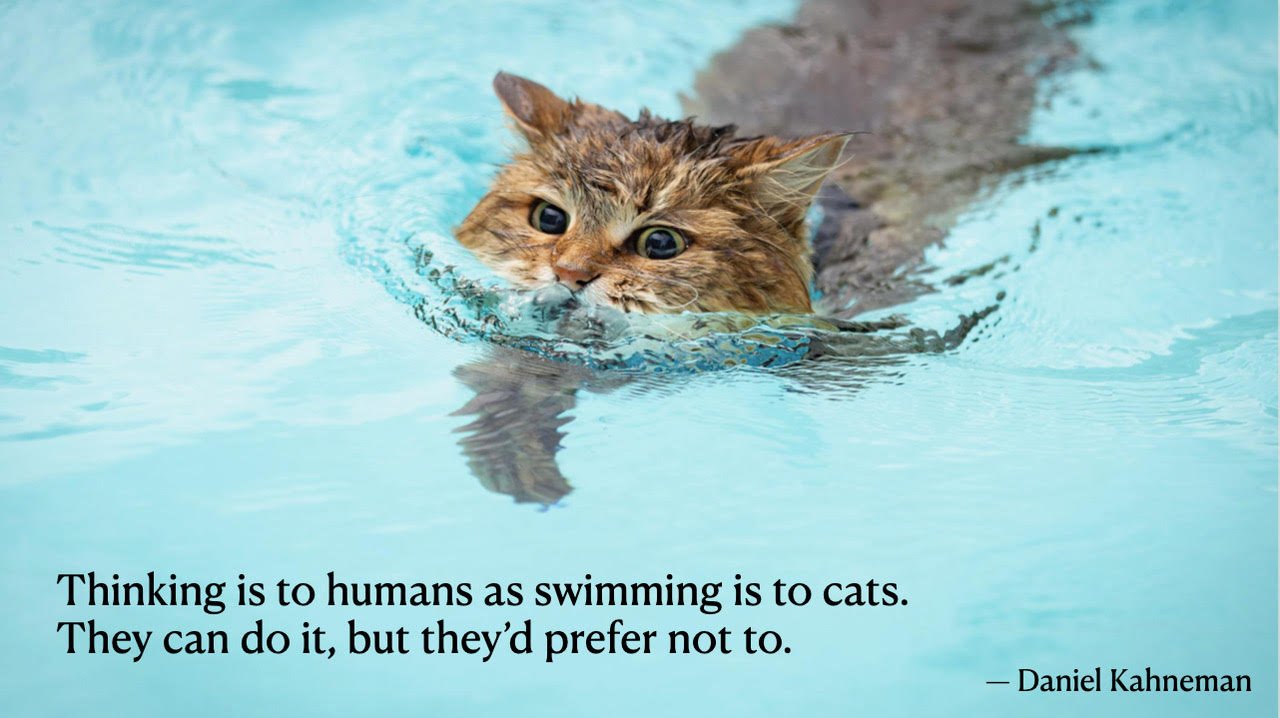 Mensen zijn van nature lui als het gaat om nadenken. Zoals ik in een van mijn presentaties zeg: “Thinking is to humans as swimming is to cats. They can do it, but they’d prefer not to.” (Daniel Kahneman) Onze hersenen vormen maar 2% van ons lichaamsgewicht, maar verbruiken 20% van onze energie. Daarom gebruiken we allerlei mentale snelkoppelingen om beslissingen te nemen.