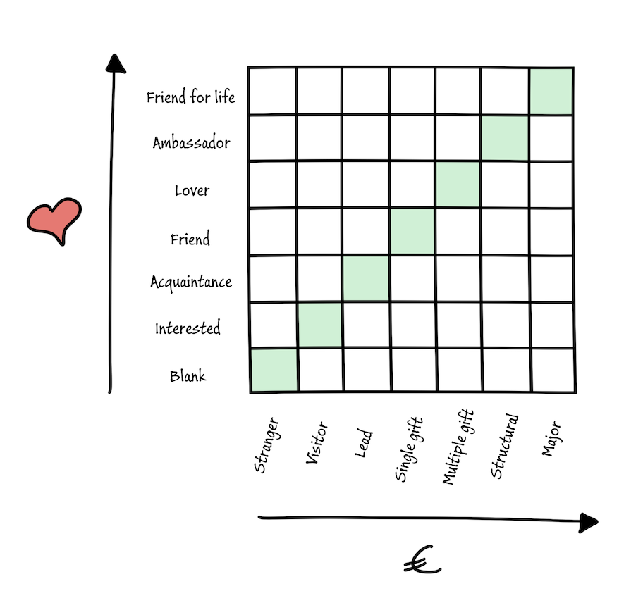 Dat vraagt wel om een andere manier van denken. Probeer niet om iemand bij het eerste contact zes stappen tegelijk op de donateurspiramide te laten maken (de horizontale as). Bouw liever gefaseerd aan de relatie. En vergroot onderweg ook de waarde voor de donateur zelf: de verticale as.